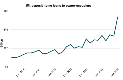 The banks approved a record $5.4 billion worth of loans to owner-occupiers with deposits of 5% or less in the December quarter, following the uncapping of the government’s Home Guarantee Scheme.