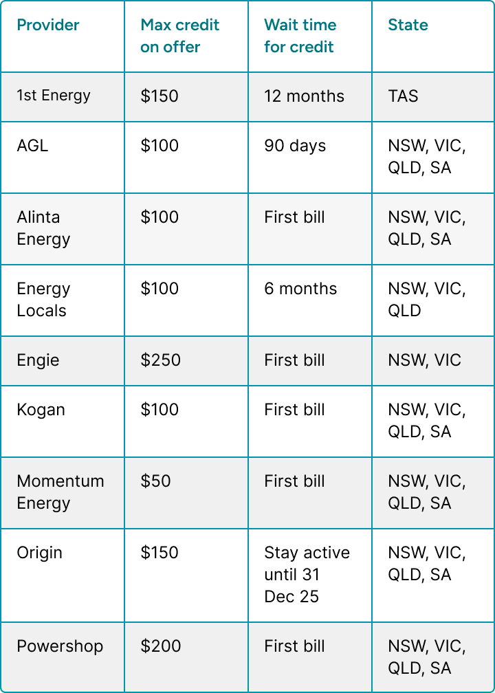 | 1st Energy | $150 | 12 months | TAS | | AGL | $100 | 90 days | NSW, VIC, QLD, SA | | Alinta Energy | $100 | First bill | NSW, VIC, QLD, SA | | Energy Locals | $100 | 6 months | NSW, VIC, QLD | | Engie | $250 | First bill | NSW, VIC, | | Kogan | $100 | First bill | NSW, VIC, QLD, SA | | Momentum Energy | $50 | First bill | NSW, VIC, QLD, SA | | Origin | $150 | Stay active until 31 Dec 25 | NSW, VIC, QLD, SA | | Powershop | $200 | First bill | NSW, VIC, QLD, SA |